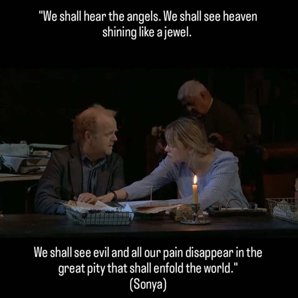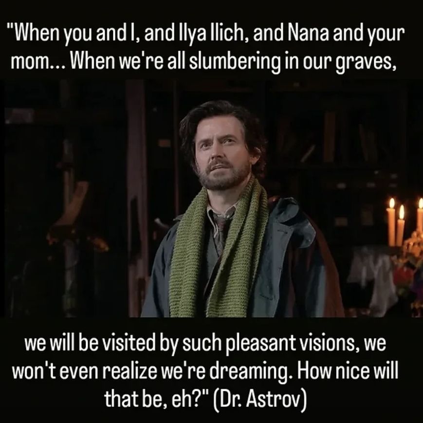 Dr. Michael Astroff: the only character viewed as interesting by others, as having a higher call, a thirst for life and creation (“Man is endowed with reason and the power to create, so that he may increase that which has been given him”) which attracts Sonya and her stepmother, Helena. Dr. Astroff is weighed down by the errors of his past, especially by the death of a patient of his under chloroform. How does he comfort himself? Aside from drinking, there’s a constant idea that he keeps repeating at the beginning and at the end of the play: “I sat down and closed my eyes like this and thought: will our descendants two hundred years from now, for whom we are breaking the road, remember to give us a kind word? No, nurse, they will forget.” To think of it, this idea is both highly disturbing and reassuring. To think of one’s own insignificance can relieve us of the heaviness of our existence, can decenter us from ourselves, from our self-centered natures, but at the same time, it makes what seems important for us, the meanings of our lives, fade away in eternity and time. Dissatisfied with his work as a doctor, he always wants to find another calling, one with which he can be in harmony, with which he could feel satisfied with meaning for his life. He finds this satisfaction in planting forests, trees being his vessels to a future in which he won’t exist: “I feel as if I had had some small share in improving the climate, and that if mankind is happy a thousand years from now I will have been a little bit responsible for their happiness”. Being so self-absorbed, having no respect to ordinary life, even that of Helena to whom he is physically attracted (he recognizes, himself, that he doesn’t have feelings of love or affection for her), Dr. Astroff is unable to love. When Sonya asks him: “You love no one?” He replies: “Not a soul. […] The peasants are all alike; they are stupid and live in dirt, and the educated people are hard to get along with. […] All our good friends are petty and shallow and see no farther that their own noses; in one word, they are dull.”