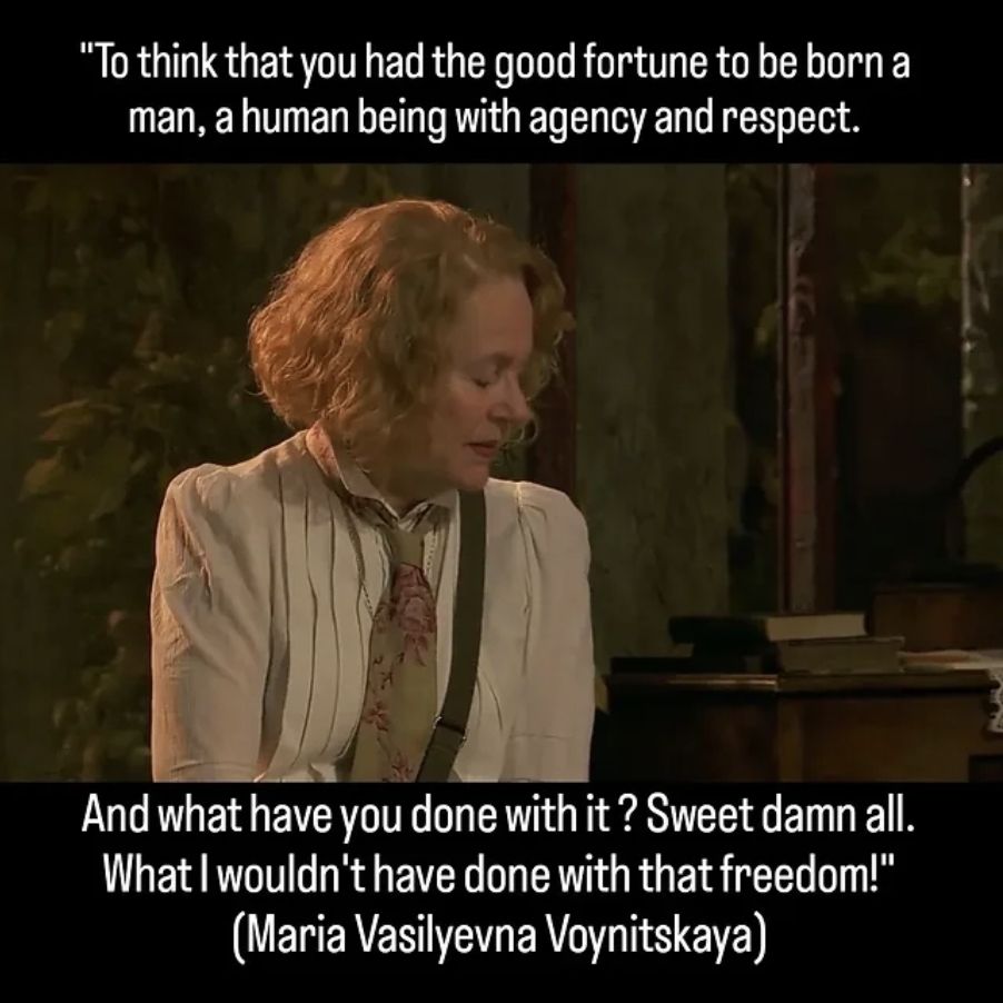 Maria Vasilyevna: Vanya’s mother. She thinks that, as a woman, she can achieve something only by supporting unconditionally a dominant male, Pr. Alexander. This is how Vanya describes her existence: “My mother, the old magpie, is still chattering about the emancipation of woman, with one eye on her grave and the other on her learned books, in which she is always looking for the dawn of a new life.” Yes, Maria Vasilyevna thirsts for a new existence, in which she can get to achieve her ambitions… perhaps as a man. She keeps reminding Vanya of his failure to achieve anything meaningful, which is a reproach that holds a special significance because, being his mother, the one who gave him life, she might be saying in fact that, in the end, he wasn’t deserving of it: “You have forgotten that a conviction, in itself, is nothing but a dead letter. You should have done something.”