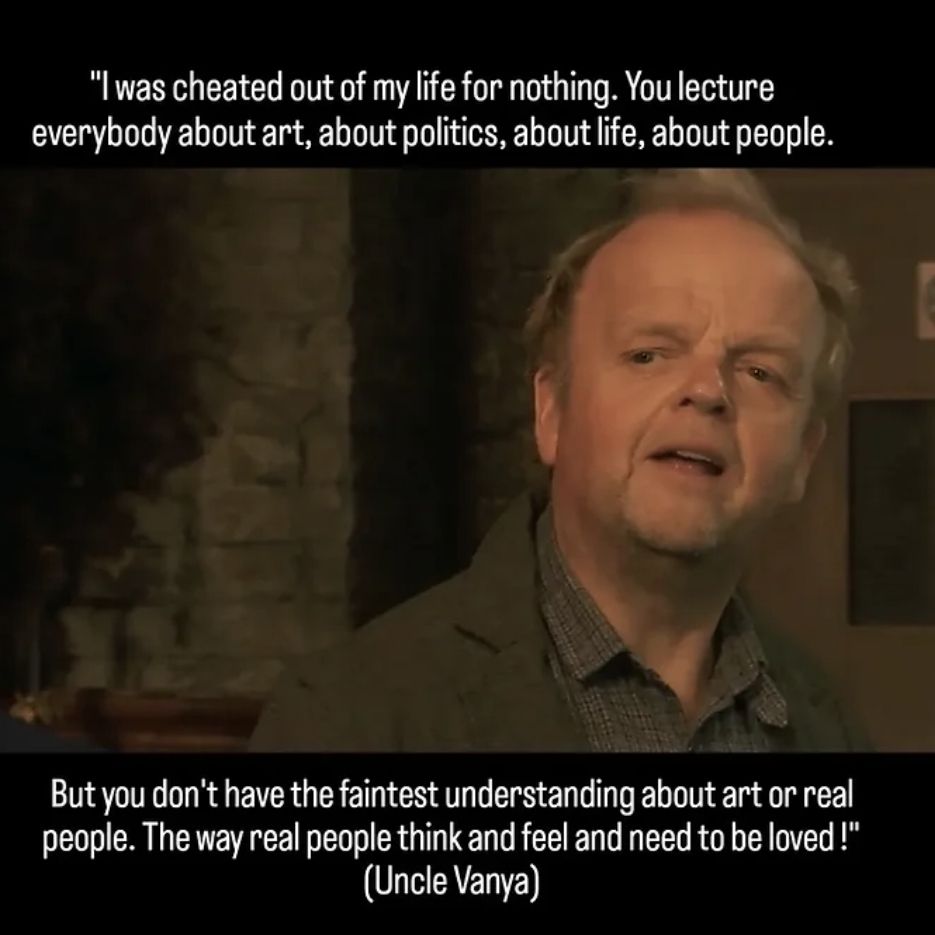 I recently had the occasion of watching the 2020 adaptation of Anton Chekov’s « Uncle Vanya » by director Ian Rickson in which every character struggles with existential anxiety, dissatisfaction and regret. I therefore decided to think about Chekov’s “Uncle Vanya” characters in detail from an existential point of view. The problem of existence is raised since the very beginning of the play with Dr. Astroff’s expression of exhaustion and emptiness in the exercise of his work and existence: “And then, existence is tedious, anyway; it is a senseless, dirty business, this life, and goes heavily. Every one about here is silly, and after living with them for two or three years one grows silly oneself. It is inevitable.” Another issue is raised here, that of boredom, or “silliness”, that comes from the mediocrity of the lives that are led by people in the country. The opposition country/city keeps coming back during the play. Country life could signify the normality, “normal people”, but also what Uncle Vanya spent his life investing, which goes to waste: what “grandeur” could someone expect from the mediocrity of country life?